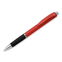 Kunststoffkugelschreiber mit Gummigrip und blauschreibender Mine.