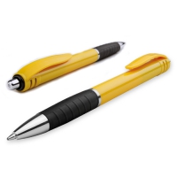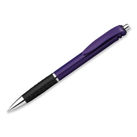 Kunststoffkugelschreiber mit Gummigrip und blauschreibender Mine.