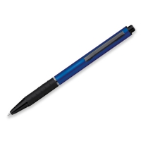 Metallkugelschreiber mit Gummigrip und blauschreibender Mine.