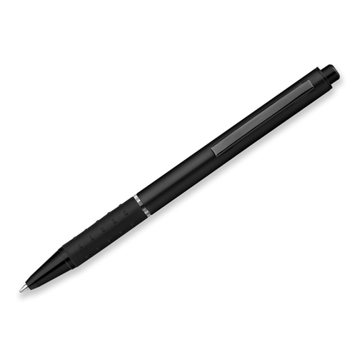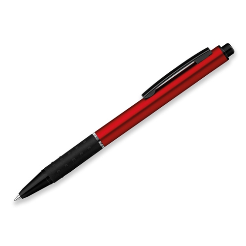 Metallkugelschreiber mit Gummigrip und blauschreibender Mine.
