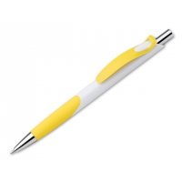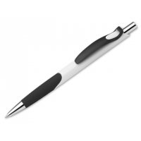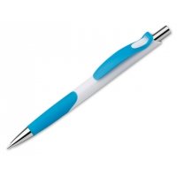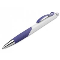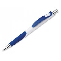 Kunststoffkugelschreiber mit Gummigrip und blauschreibender Mine.