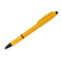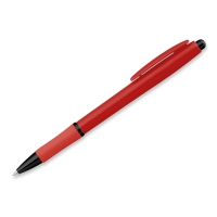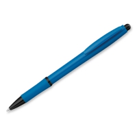 Kunststoffkugelschreiber mit Gummigrip und blauschreibender Mine.