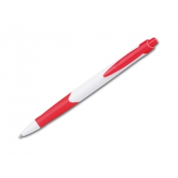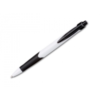 Kunststoffkugelschreiber mit Gummigrip und blauschreibender Mine.