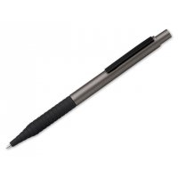 Kunststoffkugelschreiber mit Gummigrip, Metallclip und blauschreibender Mine.