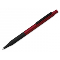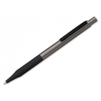 Kunststoffkugelschreiber mit Gummigrip, Metallclip und blauschreibender Mine.