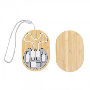 Artikel-Nr: KTO21204000000Komplettes Set aus 15W Wireless-Ladegerät und Ladekabel. Hergestellt aus poliertem Bambus, in einem originellen Gehäusedesign mit im Deckel integriertem drahtlosem Ladegerät und einer gestanzten Basis, einschließlich eines kompletten Satzes von Kabeln und Adaptern. Ladegerät kompatibel mit Qi-fähigen Geräten. Ladekabel-Set mit Datenübertragungsfähigkeit und mehreren Anschlüssen: Micro USB, Typ C und Lightning. 5V DC 3A. Präsentiert in einer Kraft-Design-Box. Materialien wie Bambus fördern die Verwendung natürlicher Rohstoffe und reduzieren die Schadstoffemissionen. Es stammt von einer sehr widerstandsfähigen und vielseitigen Pflanze mit schnellem Wachstum und Regeneration, was es zu einer ausgezeichneten Alternative zu traditionellem Holz macht. Hergestellt nach RoHS-Standards und in Übereinstimmung mit den folgenden Sicherheitsanforderungen:Überhitzungsschutzsystem.Überladungsschutzsystem. Blockiersystem zur Vermeidung von Kurzschlüssen.
