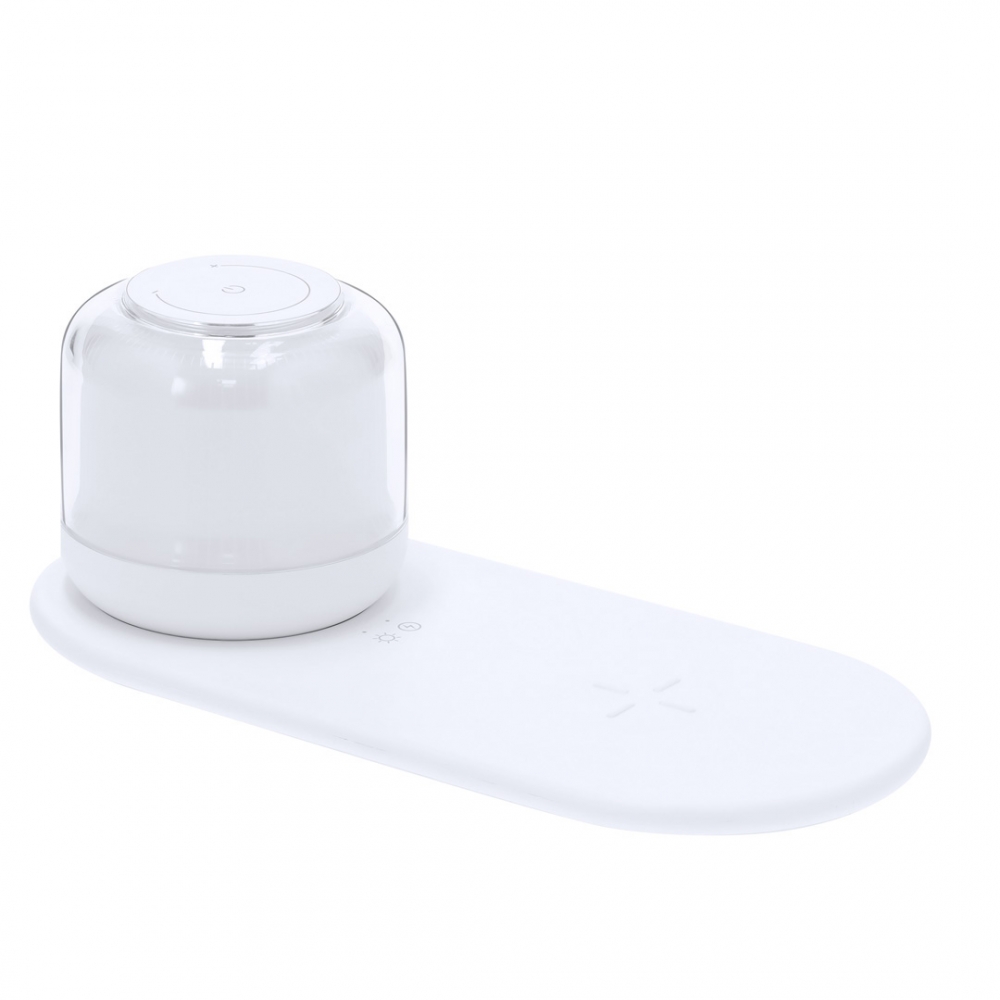 Artikel-Nr: KTO21357001000Multifunktionale Lampe. Sie enthält:- Tragbare kabellose Ladetischlampe mit 12 LEDs. Zusätzlich verfügt sie über 2 Lichtpositionen, die durch Berührungstasten einstellbar sind: eine Position mit weißem Licht und eine weitere mit verschiedenen Farben.- 15W kabelloser Ladegerät.