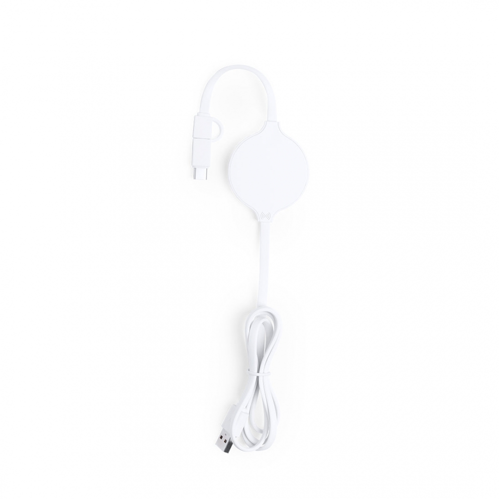 Artikel-Nr: KTO16259001000Kabelloses, ultrakompaktes Ladegerät in monochromer, weißer Farbe. Anschlüsse Dual-Micro-USB und Lightning, mit Typ-C-Adapter und Ladekontrollanzeige. Kompatibel mit Geräten, die mit kabelloser Ladetechnologie ausgestattet sind.