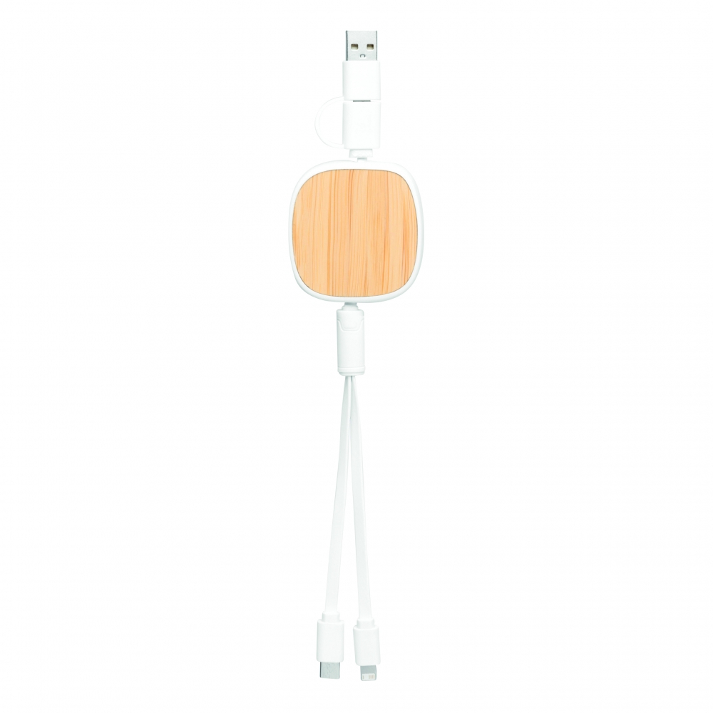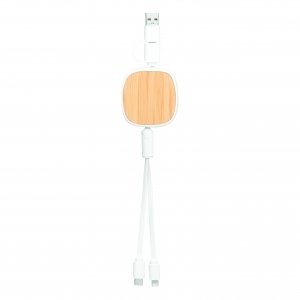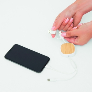 Artikel-Nr: INP56-1107380Ladekabel ROLL ON, aufrollbar (Länge: ca. 92 cm): zum Aufladen von Smartphones und USB-betriebenen Geräten, inkl. 2 Ladesteckern (USB Typ C, Kombistecker Micro-USB / Lightning), kombinierter USB Typ A / Typ C Eingangsstecker, Bambus-Platte für die Veredelung