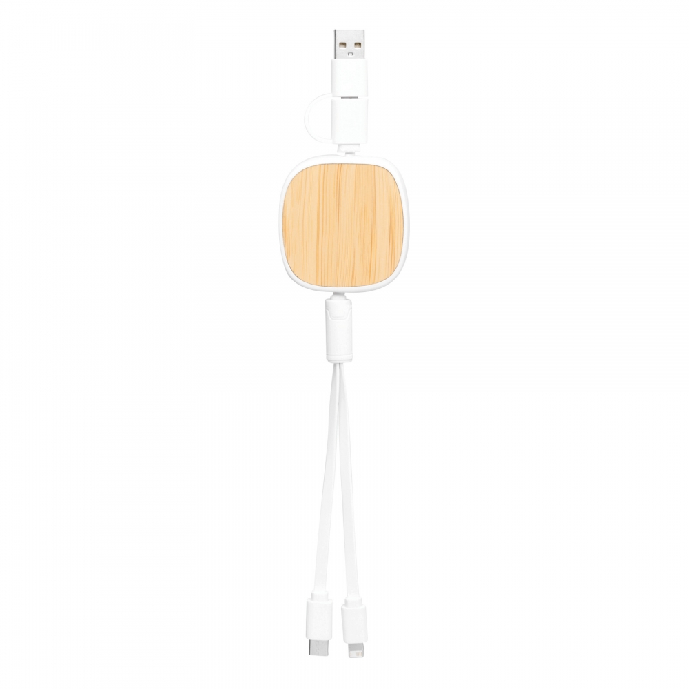 Artikel-Nr: INP56-1107380Ladekabel ROLL ON, aufrollbar (Länge: ca. 92 cm): zum Aufladen von Smartphones und USB-betriebenen Geräten, inkl. 2 Ladesteckern (USB Typ C, Kombistecker Micro-USB / Lightning), kombinierter USB Typ A / Typ C Eingangsstecker, Bambus-Platte für die Veredelung