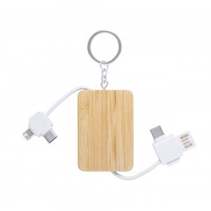 Artikel-Nr: AND722043-01Ladekabel-Schlüsselanhänger aus Bambus mit Micro-USB-, USB-C- und Lightning-Anschlüssen. Mit USB- und USB-C Eingängen.