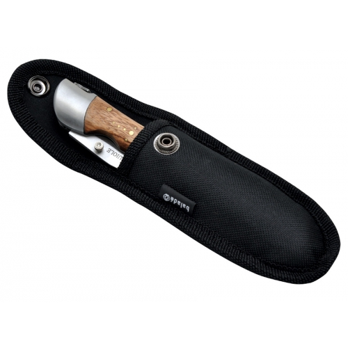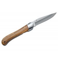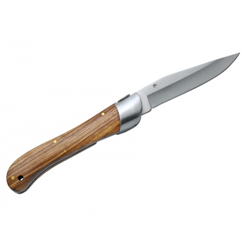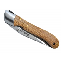 Artikel-Nr: 688DUB200'Laguiole'-Messer. Griff aus exotischer Esche. Einhändig auf- und zuklappbar, mit Sicherheitssperre. Klinge aus rostfreiem 420er Stahl, eine Vollmetallkrone aus mattem Stahl. Als Ornamente trägt dieses Modell die typische 'Laguiole-Biene' sowie ins Metall gravierte Muster auf dem Rücken von Griff und Klinge. Lieferung samt Etui aus schwarzem Nylon 600D mit Gürtelschlaufe.