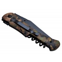 Artikel-Nr: 688DUB214Klappmesser mit halb gezahnter 420er Edelstahlklinge, Titanüberzug. Einhandöffnung. Sicherheitssperre vom Typ Liner Lock. Nutzbare Klingenlänge: 10 cm. Griff aus Edelstahl und Aluminium in Tarnfarben. Gürtelclip. Korkenzieher 4 Spiralen aus Edelstahl mit Titanüberzug. Traditionelle Guillochierarbeiten. Lieferung mit Gürteletui aus schwarzem Nylon 600D.