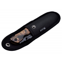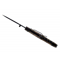 Artikel-Nr: 688DUB214Klappmesser mit halb gezahnter 420er Edelstahlklinge, Titanüberzug. Einhandöffnung. Sicherheitssperre vom Typ Liner Lock. Nutzbare Klingenlänge: 10 cm. Griff aus Edelstahl und Aluminium in Tarnfarben. Gürtelclip. Korkenzieher 4 Spiralen aus Edelstahl mit Titanüberzug. Traditionelle Guillochierarbeiten. Lieferung mit Gürteletui aus schwarzem Nylon 600D.