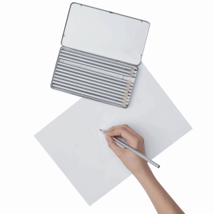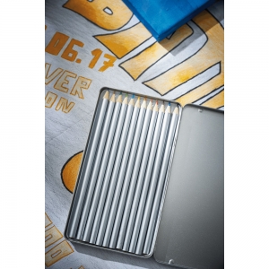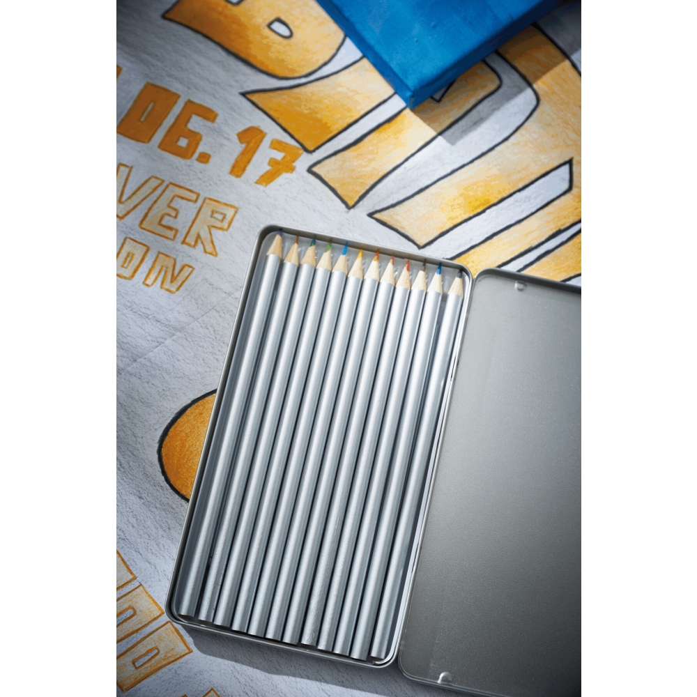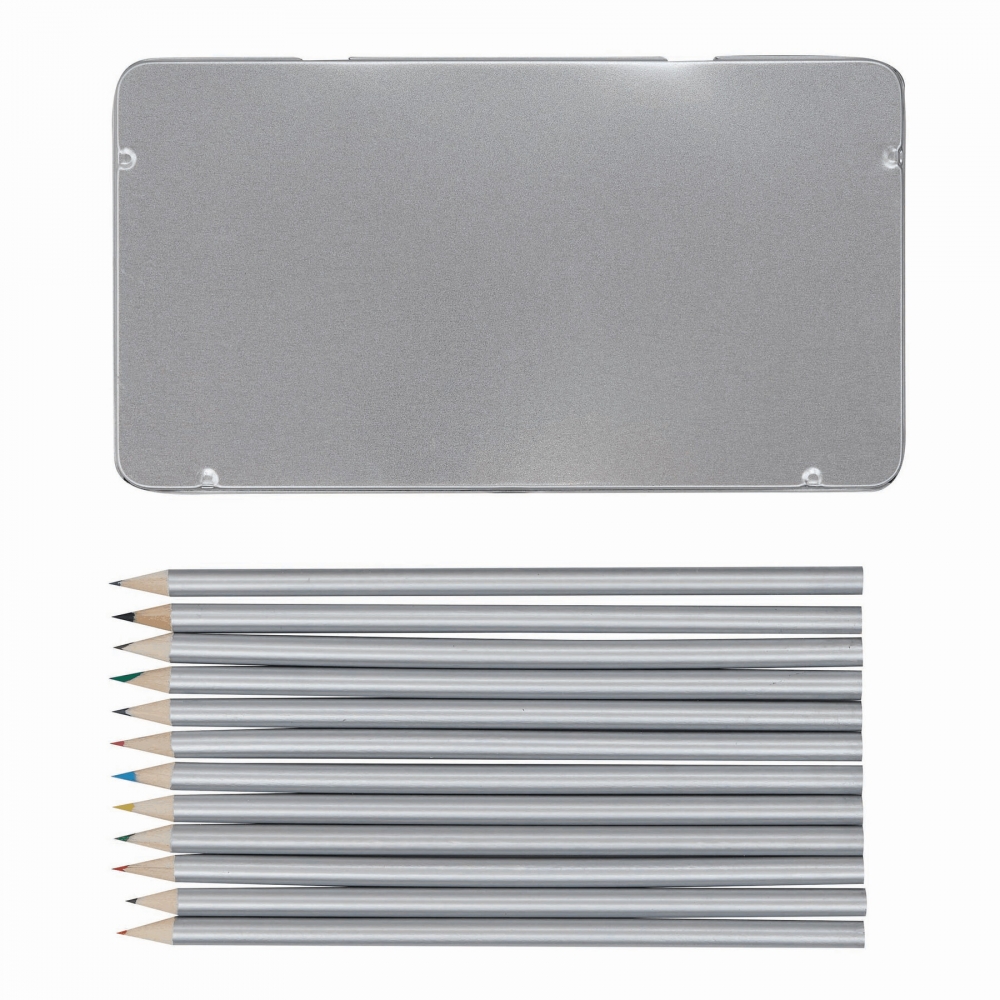 Artikel-Nr: INP56-0504085Lange Buntstifte SILVERSTAR: 12 Stück, verschiedenfarbig, silber lackiert, angespitzt, in Metallbox