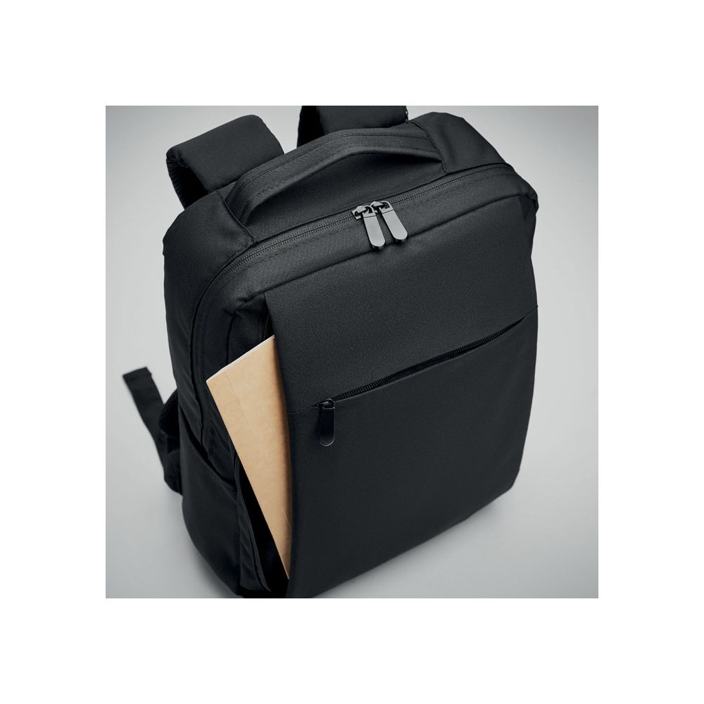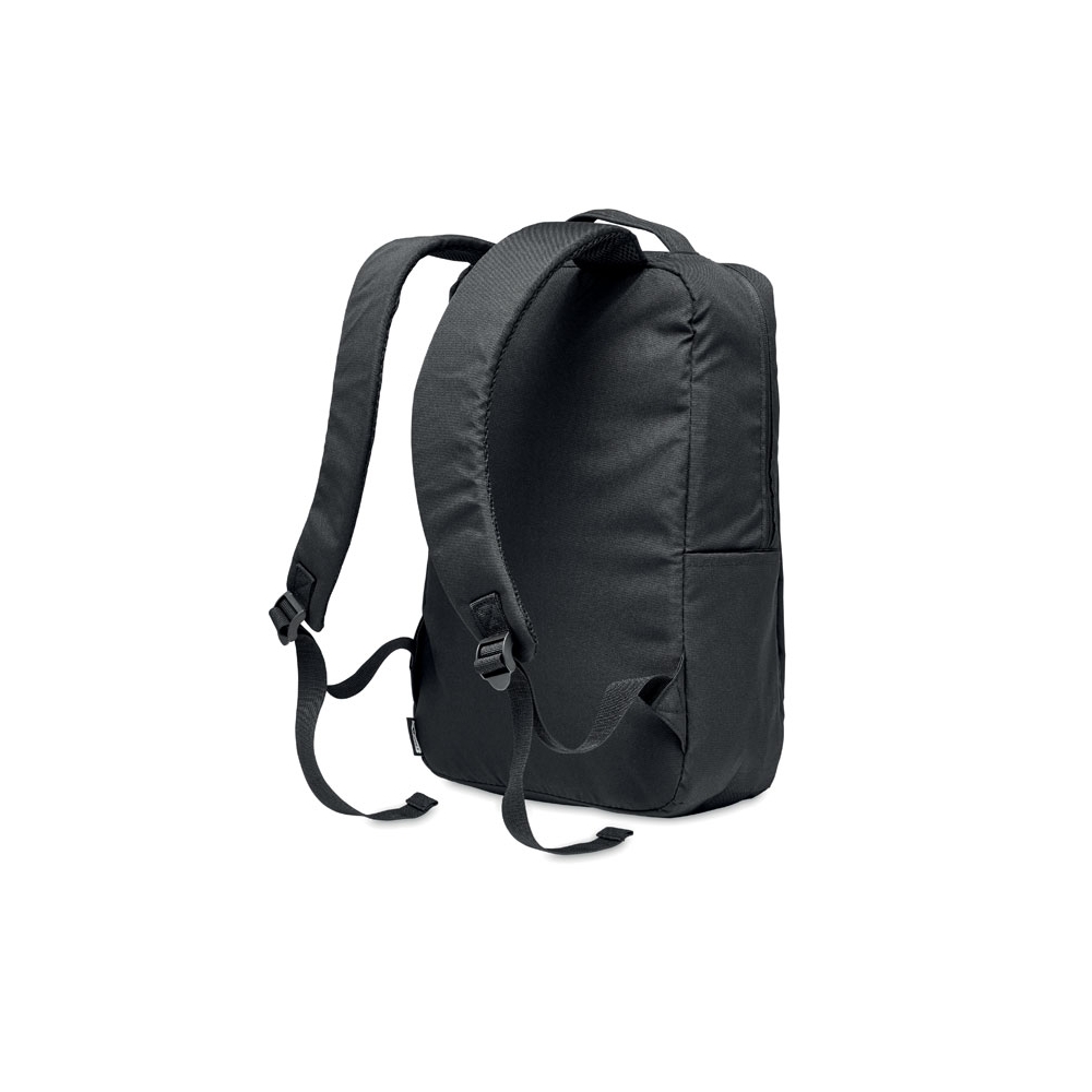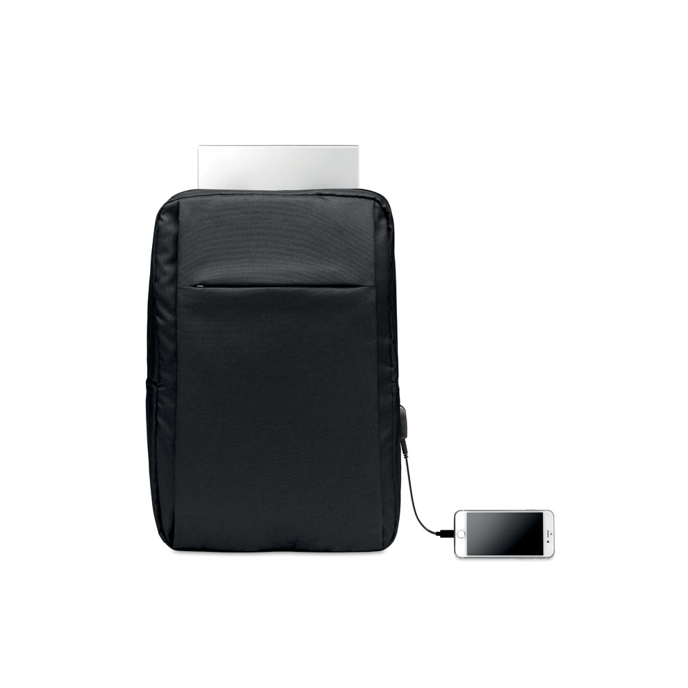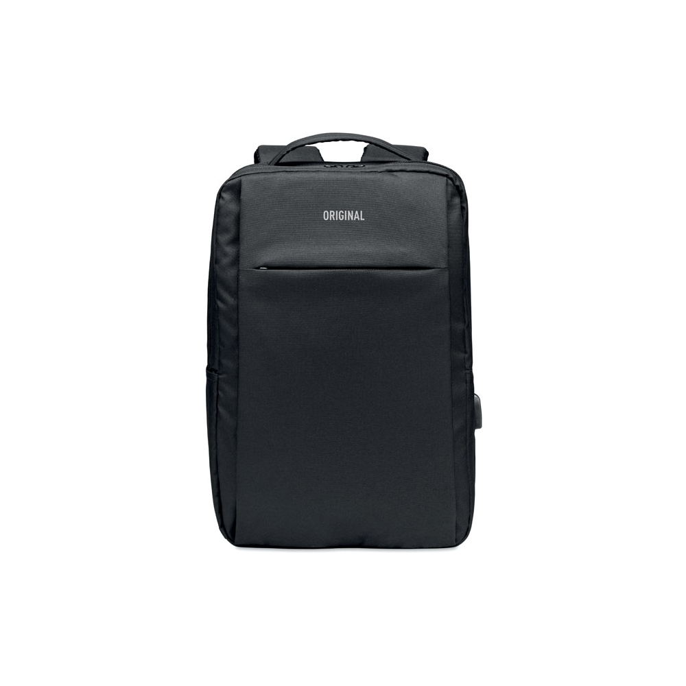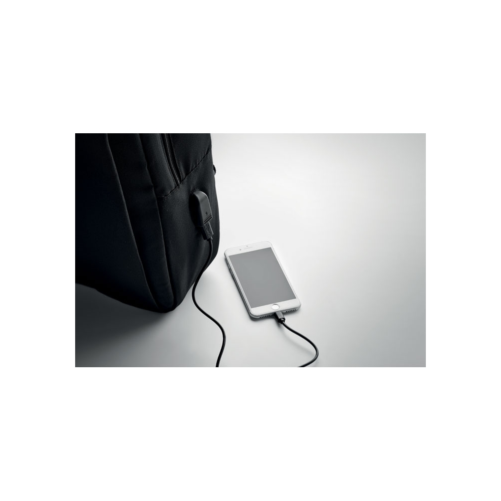 Artikel-Nr: OCBMO6328-0313' Laptop Rucksack aus 300D RPET Polyester. Innenfach mit Platz für einen 16' Laptop. Inkl. USB-Ladekabel. Gepolsterte Schultergurte.