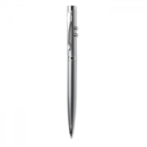 Artikel-Nr: OCBMO8193-14Multifunktionskugelschreiber mit silberfarbenem Gehäuse. LED-Licht und Laserpointer. Inklusive 3 Knopfzellen. Verpackt in einer Holzbox. Blaue Tinte.
