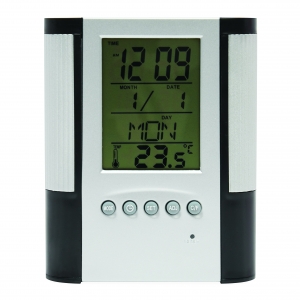 Artikel-Nr: INP56-0401315LCD-Wecker BUTLER: mit integriertem Stiftehalter, Datumsanzeige und Thermometer, in Box