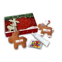 Verpackung: Lebkuchen - Elch, Zuckergusstube und Schokolinsen werden in bedrucktem Karton verpackt.