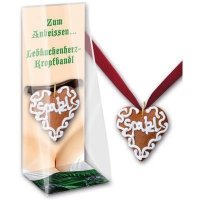 Artikel-Nr: W567ZS312Feinstes Honiglebkuchenherz mit Zuckerguss von Hand verziert und beschriftet. Schmuckstück wird mit Metallring versehen und mit Samtband aufgebunden.
