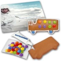 Verpackung: Lebkuchen LKW, Zuckergusstube und Schokolinsen werden in bedrucktem Karton verpackt.