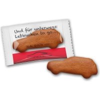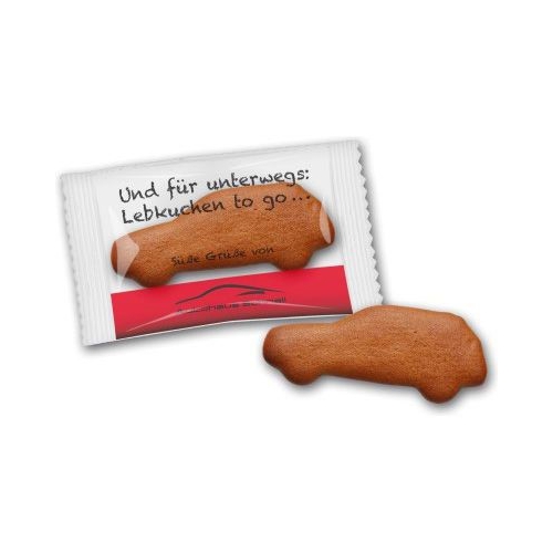Feinster Honiglebkuchen natur in Autoform gebacken. Gewicht: ca. 17g Verpackung: Einzeln in bedruckter Glanzfolie per Flowpack verpackt. Haltbarkeit: 6 Monate