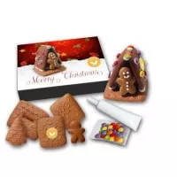 Verpackung: Lebkuchenbauteile, Zuckergusstube und Schokolinsen werden in bedrucktem Karton verpackt.