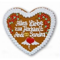 Großes Lebkuchenherz mit Handbeschriftung und farbiger Deko nach Kundenwunsch. Gewicht: 1000g Verpackung: Eingeschweißt und mit Umhängeband versehen. Haltbarkeit: 6 Monate
