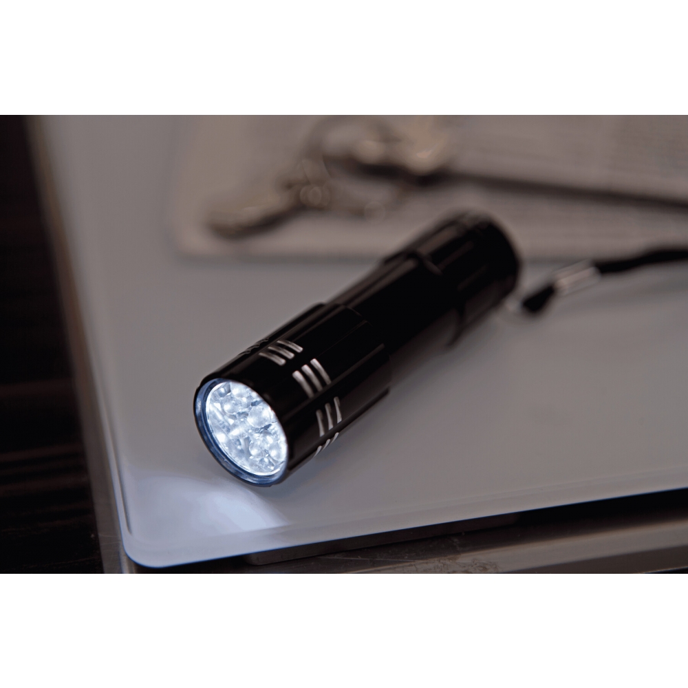 Artikel-Nr: INP56-0699903LED-Taschenlampe POWERFUL: 9 lichtstarke weiße LED, An- und Ausschalter, Handschlaufe, batteriebetrieben (3xAAA Batterien enthalten), in Box