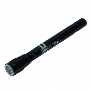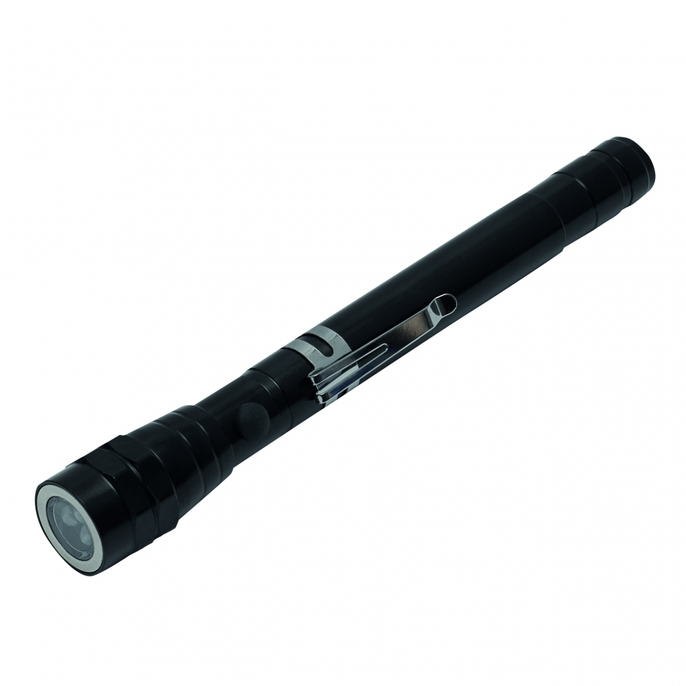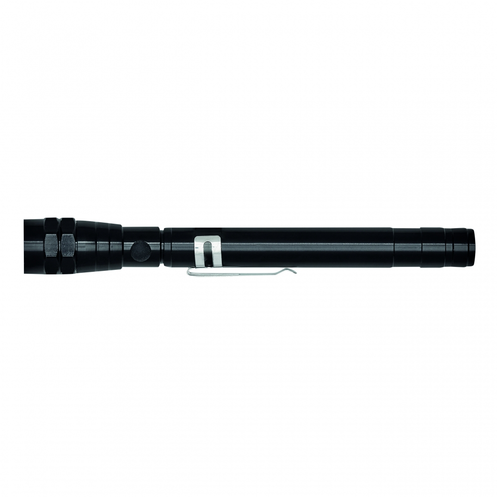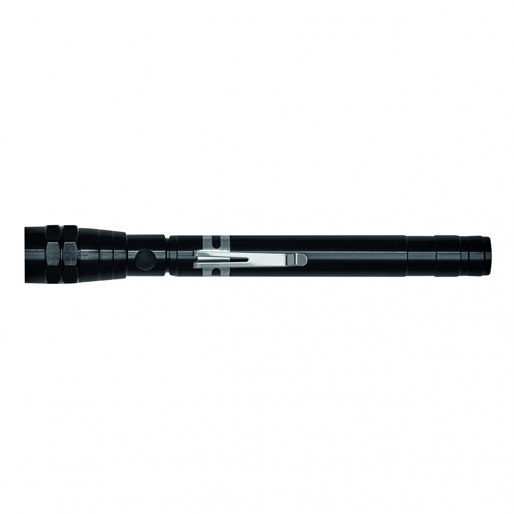 Artikel-Nr: INP58-0600611LED-Taschenlampe REFLECT: 3 lichtstarke weiße LED, gummierter An- und Ausschalter, mit bis auf ca. 55 cm ausziehbares Teleskopsystem, schwenkbarer Lampenkopf, Magnetring, praktischer Befestigungsclip, Gehäuse aus Aluminium, batteriebetrieben (4x LR44 Knopfzellen enthalten), in Box