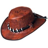 Artikel-Nr: W45295H51Jeder Hut ein Unikat! Ein ganz besonderes Stück, das aus 28 Krötenhäuten hergestellt wurde und mit seinem exklusiven Kroko-Lederhutband und den Zahnverzierungen absolut einzigartig ist. Crocodile-Dundee würde ihn vermutlich nicht mal zum Schlafen ausziehen. Ein außergewöhnliches Produkt, das allerhöchsten (Qualitäts-)Ansprüchen genügt. Besondere Eigenschaften: Formstabil, wetterfest und hochwertig. Die schöne Krempe kann mittels Drahteinlage individuell geformt werden. Material: Cane Toad. Farbe: Braun. Größen: S - XL.