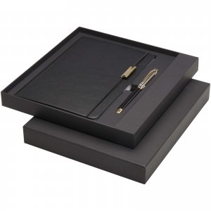 Artikel-Nr: CPO10792590Der Legato ist eine elegante Kombination aus einem Notizbuch im Format A5 und einem Tintenroller. Der Tintenroller hat einen oberen Schaft aus recyceltem Messing mit goldfarbener Verchromung, einen unteren Schaft mit schwarz / brauner Pulverbeschichtung, goldfarbene Metallaccessoires und ein LUXE-Logo auf dem mittleren Ring. Tintenfarbe: Schwarz. Schreiblänge: 400 Meter. Strichstärke: 0,7 mm. Das Notizbuch hat 80 Blatt liniertes Papier (80 g / m²), einen Einband aus recyceltem Kunststoff, einen elastischen Verschluss, ein Lesebändchen und eine Ziehharmonikatasche. Der elastische Verschluss ist mit einem goldfarbenen Metallaccessoire versehen. Verpackt in einer Geschenkbox aus recyceltem Karton.