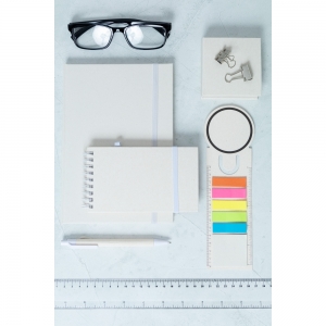 Artikel-Nr: AND800777-01Lesezeichen aus recyceltem Milchkarton mit Linealfunktion, 15 Haftnotizzetteln und 75 Seitenmarkern (in 5 unterschiedlichen Farben).