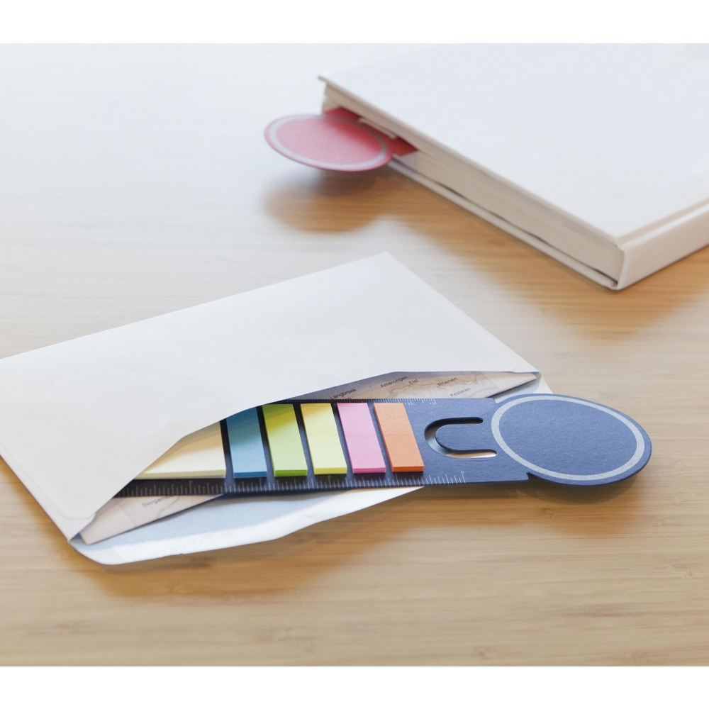 Artikel-Nr: GIV3115011Lesezeichen aus Pappe, inklusive Haftnotizen (klein und groß) und Linealaufdruck.
