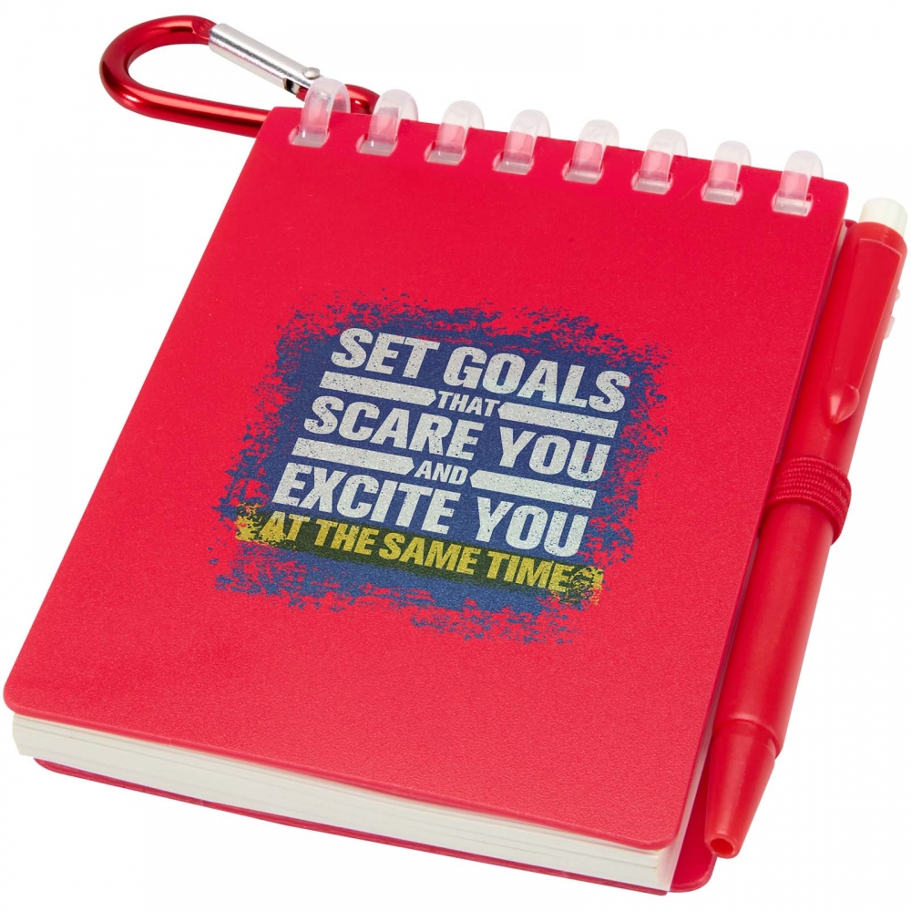 Artikel-Nr: CPO10705121Das Lig Mini Notizbuch und Stiftset ist ein kompakter und praktischer Begleiter für Notizen unterwegs. Das spiralgebundene Notizbuch verfügt über einen weichen Einband aus recyceltem Kunststoff sowie 70 leere Seiten aus 120 g / m² wasserfestem Steinpapier und ist somit ideal für die Verwendung im Freien geeignet. Mit seinen abgerundeten Ecken und der integrierten Stifthalterung folgt es dem Trend zu Mini Formaten und bleibt dabei funktional. Der passende Kugelschreiber besteht aus recyceltem ABS Kunststoff, schreibt mit schwarzer Tinte und hat eine Schreiblänge von 250 Metern. Ein farblich abgestimmter Metallring ermöglicht die einfache Befestigung des Sets an einem Rucksack, einer Handtasche oder einem Schlüsselbund. Somit eignet es sich perfekt für Notizen unterwegs. Notizbuchformat: 11 × 7,5 cm.