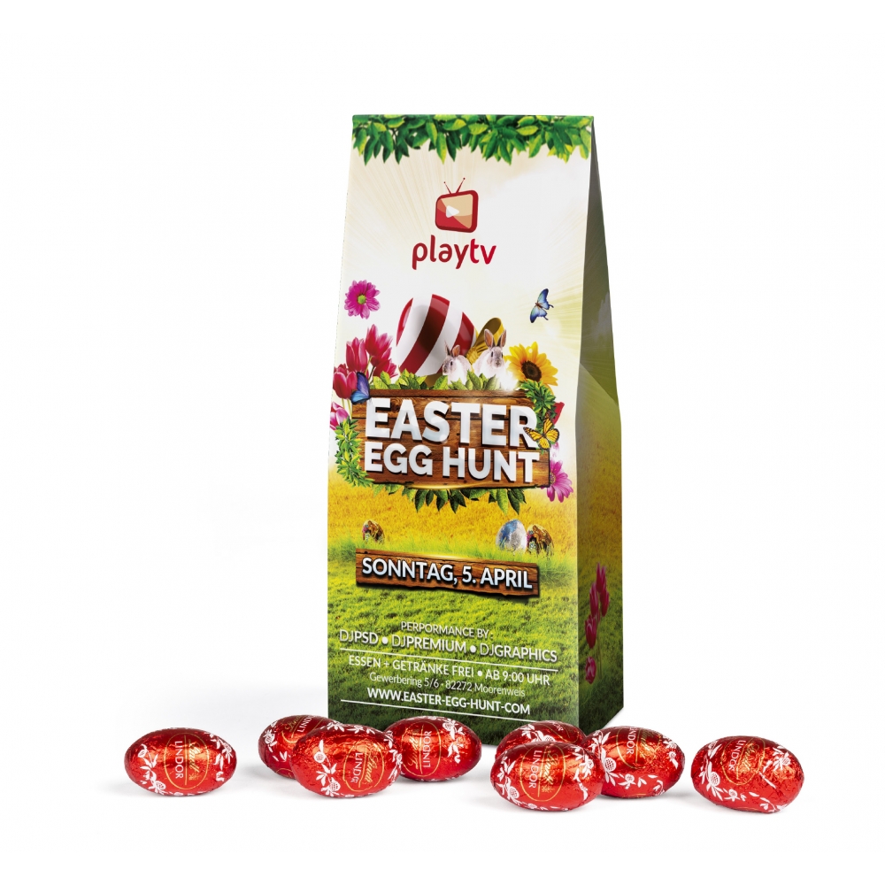 Artikel-Nr: MGN11008-0001Feinste Lindt Lindor Ostereier aus zartschmelzender Milchschokolade, verpackt in einer individuell bedruckten Standboden-Kartonage aus FSC® zertifiziertem Karton. Erhältlich in zwei Größen – das ideale Präsent für genussvolle Ostermomente.