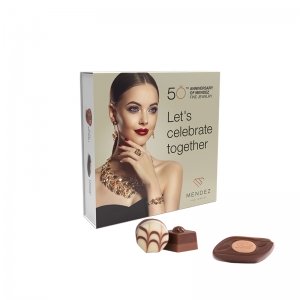 Geschmacksrichtungen / Sorten: Coeur a l'orange, Macchiato Stern, Caramel Amande, Vollmilch mit Krokant, Marc de Champagne Trüffel