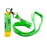 Artikel-Nr: A358LB04Lippenpflegestift mit farblich wählbarem Clip und neutralem Lanyard, 1c-Druck auf Lanyard gegen Aufpreis möglich.