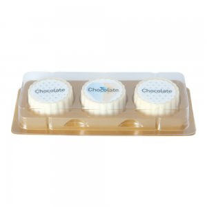 Artikel-Nr: PRM530004_00Logo-Praline aus weißer Schokolade mit Haselnuss Praliné Füllung, rechteckig oder rund, bis 4-c-bedruckt, 3er Verpackung
