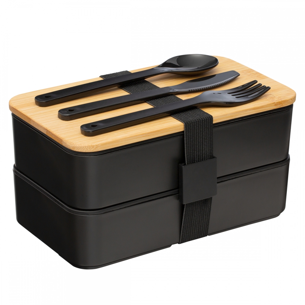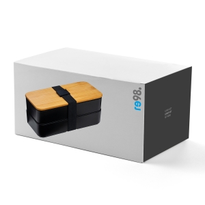 Artikel-Nr: RFS52581Ob für die Arbeit, Schule oder Freizeit - Lunchboxen sind für viele Menschen täglich genutzte Gegenstände und haben eine hohe Nutzungsdauer. Platzieren Sie Ihre Werbebotschaft im Alltag der Kunden und bereiten sie Ihnen Freude mit unserem Multitalent RE98-Laudat. Die Lunchbox aus BPA-freiem Kunststoff enthält zwei schwarze 500 ml Behälter, die durch eine Trenneinheit separiert werden. Im Innern der Trenneinheit verbirgt sich ein schwarzes Besteck aus Kunststoff, bestehend aus Messer, Gabel und Löffel. Dort ist das Besteck sicher verstaut und klemmt in passenden Haltern. Ein Speisentrenner für eine der beiden Boxen ist ebenfalls enthalten. Der Deckel der Lunchbox ist aus Bambus und Kunststoff gefertigt. Eine Besonderheit: Kunststoff und Bambus lassen sich trennen und die Kunststoff-Komponenten so leicht in die Spülmaschine gegeben werden. Das Bambusbrett ist ergänzend als Schneidebrett verwendbar. Für zusätzliche Stabilität wird die gesamte Box von einem schwarzen Gummiband umschlossen. Veredelt werden kann der Deckel mit einer CO2-Lasergravur, UV- oder Tampondruck. Die Speisebehälter aus Kunststoff können mit einem Tampondruck individualisiert werden. Auf der Kunststoffschnalle des Bandes kann ein Druck erfolgen.