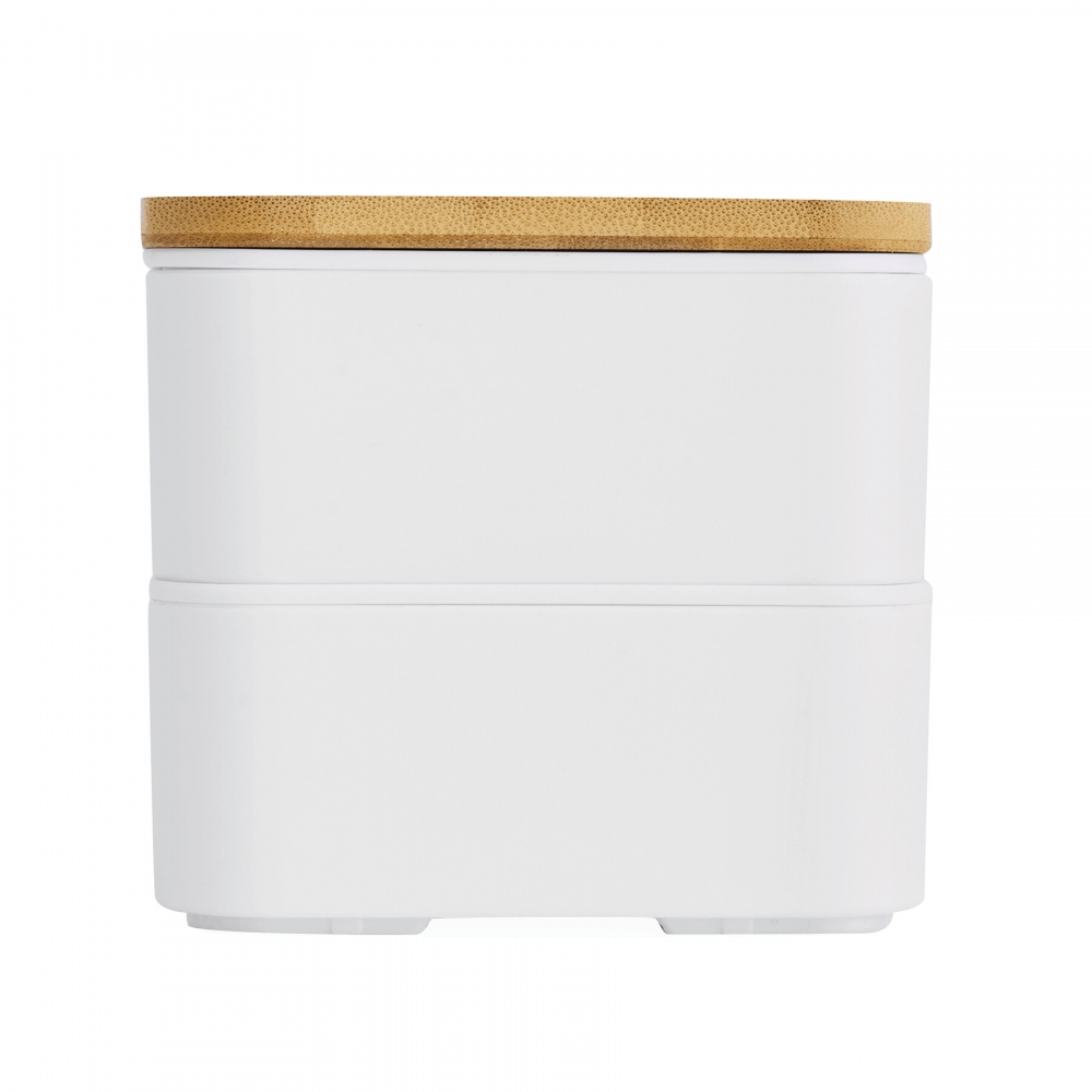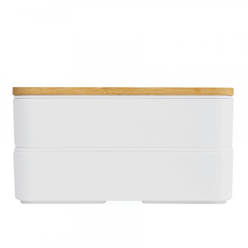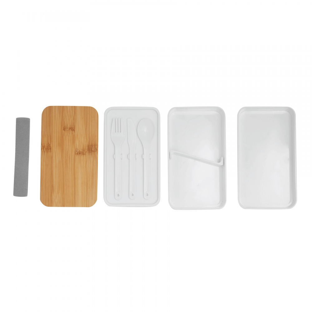 Artikel-Nr: INP56-0306056Lunchbox DOUBLE LEVEL: mit Gummiband zum Verschließen, 2 separate Dosen (Füllmenge jeweils ca. 400 ml), Zwischendeckel mit Besteck (Messer, Gabel, Löffel), variabler Trenneinsatz, Bambus-Deckel auch als Schneidebrett verwendbar