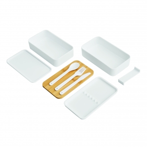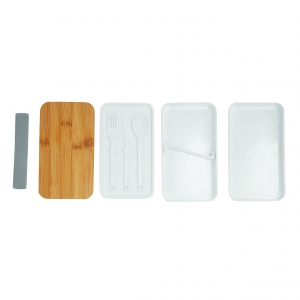 Artikel-Nr: INP56-0306056Lunchbox DOUBLE LEVEL: mit Gummiband zum Verschließen, 2 separate Dosen (Füllmenge jeweils ca. 400 ml), Zwischendeckel mit Besteck (Messer, Gabel, Löffel), variabler Trenneinsatz, Bambus-Deckel auch als Schneidebrett verwendbar