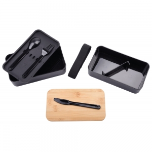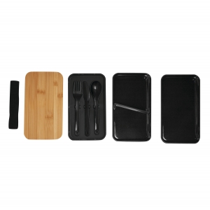 Artikel-Nr: INP56-0306055Lunchbox DOUBLE LEVEL: mit Gummiband zum Verschließen, 2 separate Dosen (Füllmenge jeweils ca. 400 ml), Zwischendeckel mit Besteck (Messer, Gabel, Löffel), variabler Trenneinsatz, Bambusdeckel auch als Schneidebrett verwendbar
