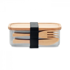 Artikel-Nr: OCBMO9967-40Lunchbox aus Edelstahl. Deckel, Messer und Gabel aus Bambus. Inkl. Elastikbandhalter für das Besteck. Füllmenge: 600ml. Da Bambus ein natürliches Material ist, können Farbton und Maße pro Artikel variieren. Dies kann zu Abweichungen im Ergebnis der Veredlung führen.
