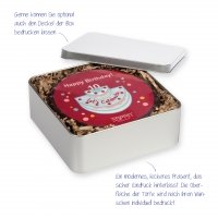 Artikel-Nr: 4943102Feiner Torten-Genuss aus einer hochwertigen Metallbox. Die dekorative Designtorte können Sie in zwei Geschmacksrichtungen wählen und mit Ihrem Wunschmotiv bedrucken lassen. Komplettieren Sie Ihr Präsent mit einem 4-farbigen Digitaldruck auf dem Deckel der Box. So setzen Sie Ihre Botschaft perfekt in Szene.