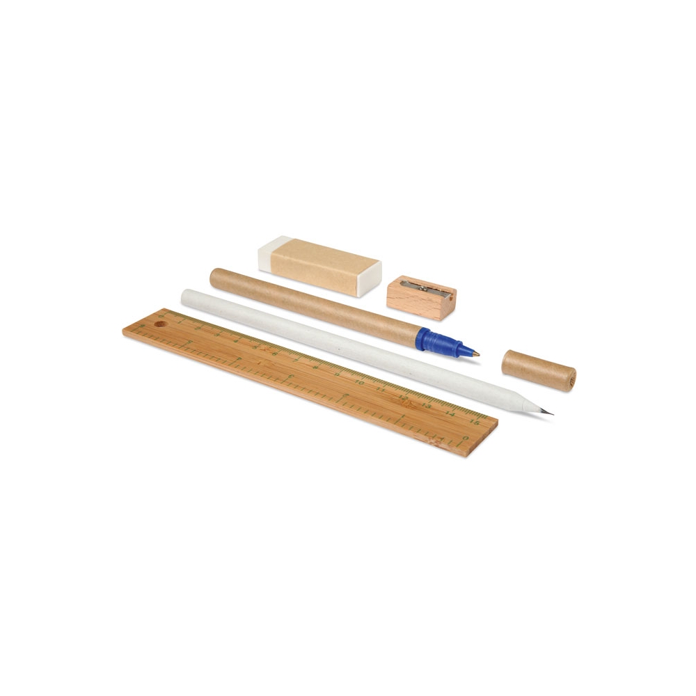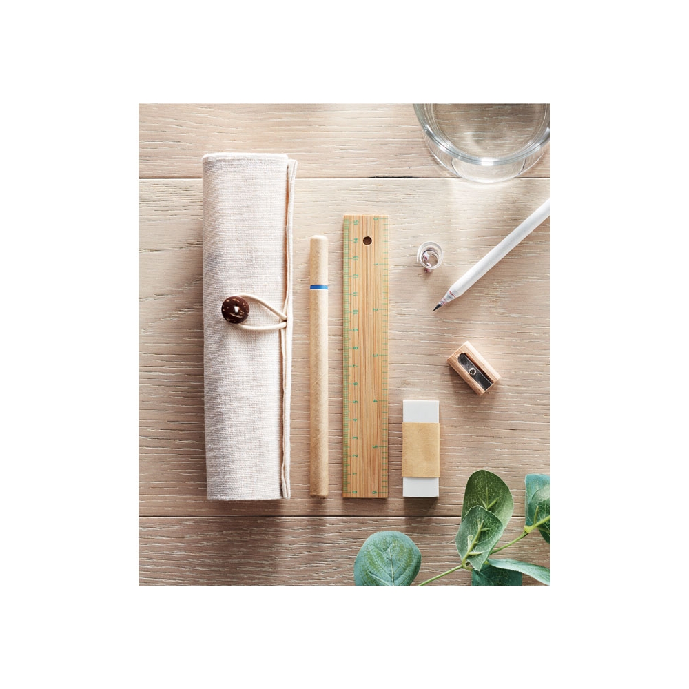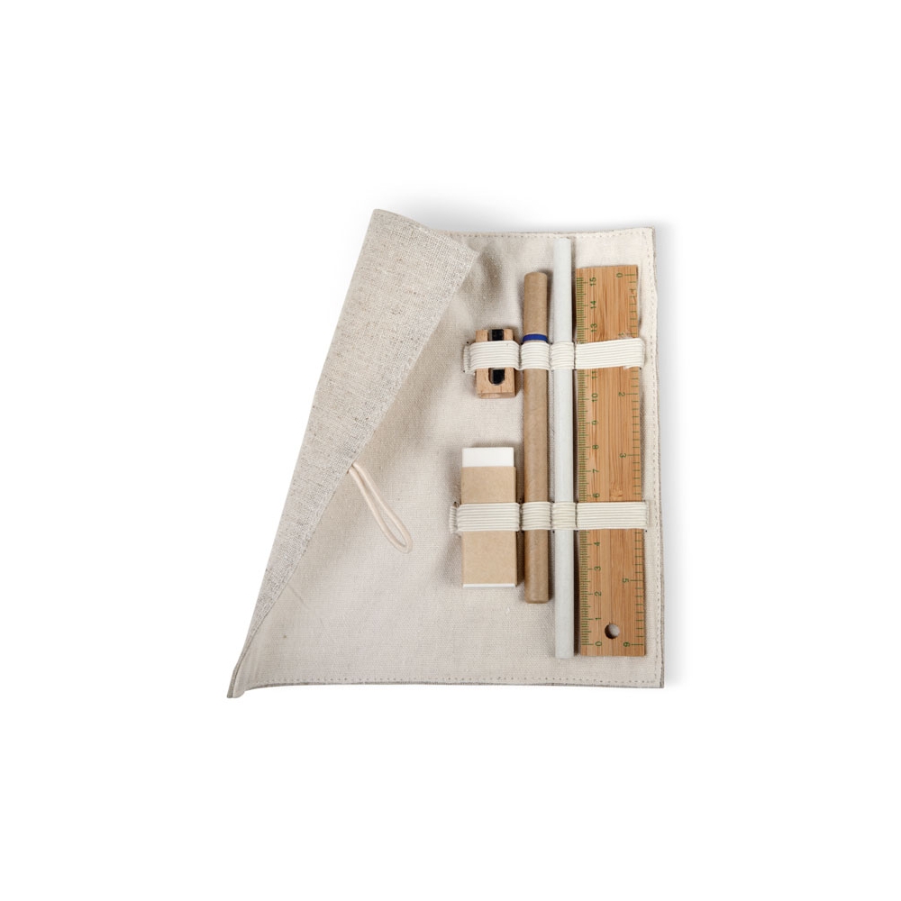 Artikel-Nr: OCBMO7755-13Mäppchen aus Jute und Baumwolle. Holzknopfverschluss. Inklusive 15 cm Bambuslineal, Bleistift, Kugelschreiber mit blauer Tinte, Holzspitzer und Radiergummi. Bambus ist ein natürliches Produkt, es kann daher zu leichten Abweichungen in Farbe, Dekor und Maßen kommen.