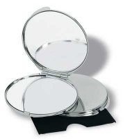 Make-up Spiegel (Normal- und Vergrößerungsspiegel). Glänzendes Metall. Im Veloursetui. Abmessung: 0,5xØ6 cm. Druckgröße: 40x40 mm. Erhältlich in den abgebildeten Farben.