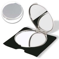 Make-up Spiegel (Normal- und Vergrößerungsspiegel). Aus Aluminium. Im Veloursetui. Abmessung: 0,7xØ6,2 cm. Druckgröße: 40x40 mm. Erhältlich in den abgebildeten Farben.