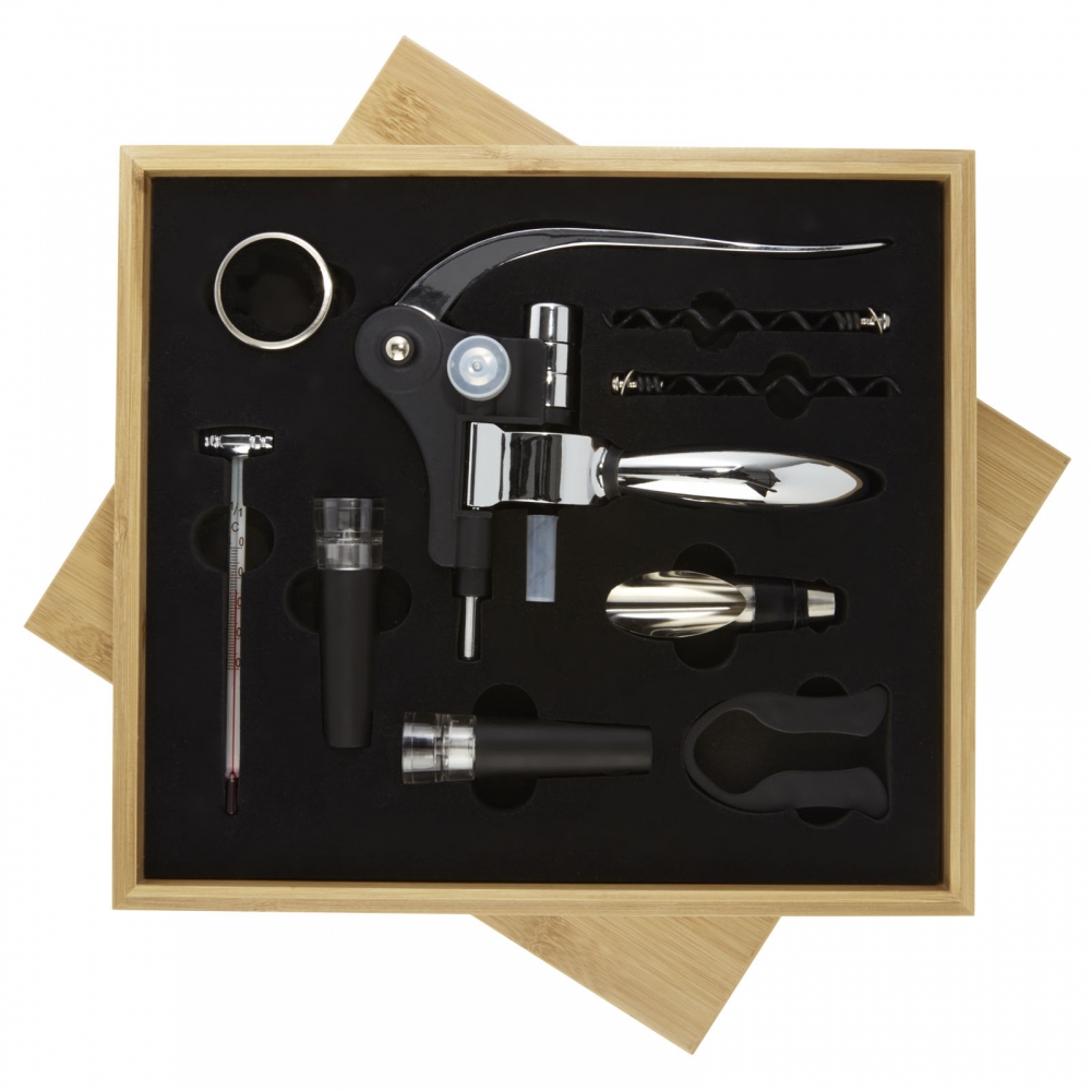 Artikel-Nr: CPO113145069-teiliges Weinset bestehend aus 1 Korkenzieher, 2 Stopfen, 1 Ausgießer, 1 Ring, 1 Banderolennschneider, 1 Thermometer und 2 Ersatzkorkenzieher. Geliefert in einer Bambus-Geschenkbox, die nach nachhaltigen Standards bezogen und produziert wird.