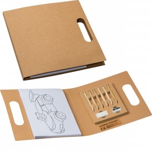 Artikel-Nr: MCM5049301Malbuchmappe in recyceltem Einband, Malblock (30 Blatt, 10 Motive á 3 Stück), Tragegriff, Spitzer, Radiergummi und Buntstifte in 6 verschiedenen Farben. Ihre Werbung wird auf den Einband gedruckt.